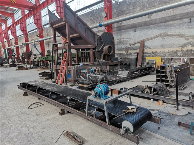 羞羞视频在线免费看机械金属破碎机生产线生产现场拍摄,其中设备配件包括皮带输送带、布袋除尘器、金属破碎机主机、上料机等配置。